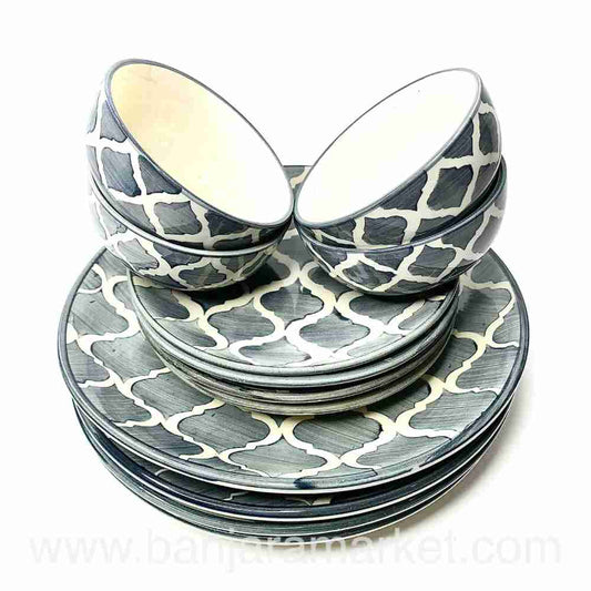 Banjara Market | Grey Moroccan Print Dinner Set (Set of 12)