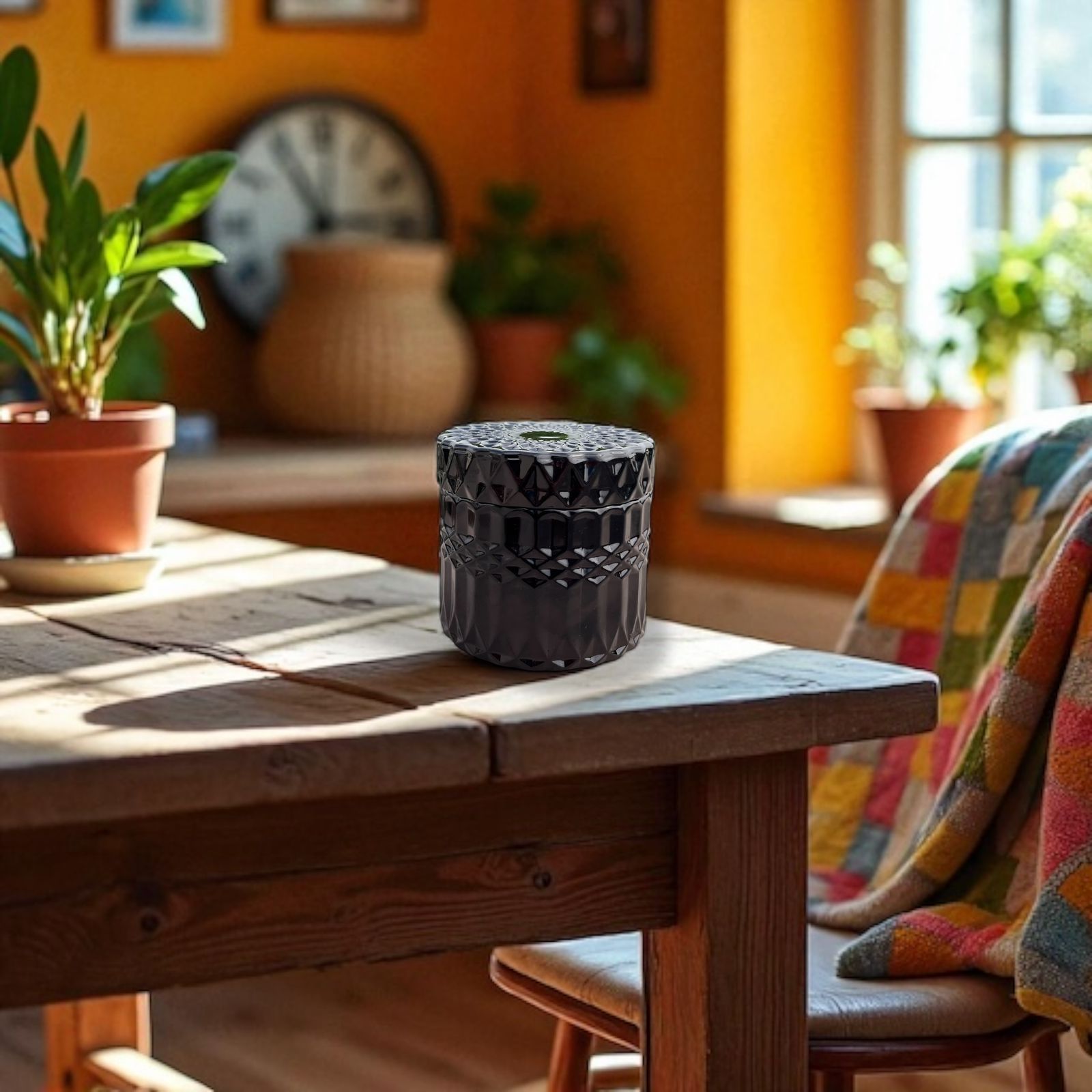 Bold, mysterious, and effortlessly chic — our Black Diamond Jar Candle is a true statement piece. Encased in a striking faceted black glass jar, this 220 mL candle brings a moody elegance to any setting. When lit, it casts a soft, enchanting glow through the dark crystal, creating an atmosphere of intrigue and allure. Hand-poured with high-quality wax and enriched with a deep, lingering fragrance, it’s perfect for intimate evenings or luxe gifting