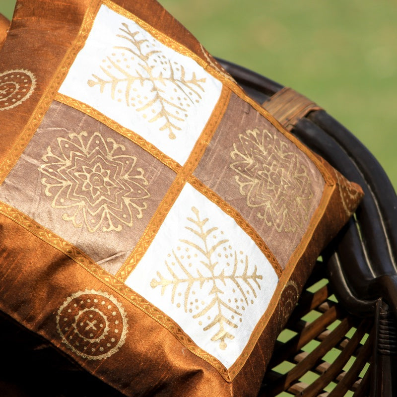 This Jaipuri set of cushion covers is made of raw silk. The art employed is known as block printing, for which Jaipur is well-known. The gold colour along with the traditional motifs give this set a royal look.