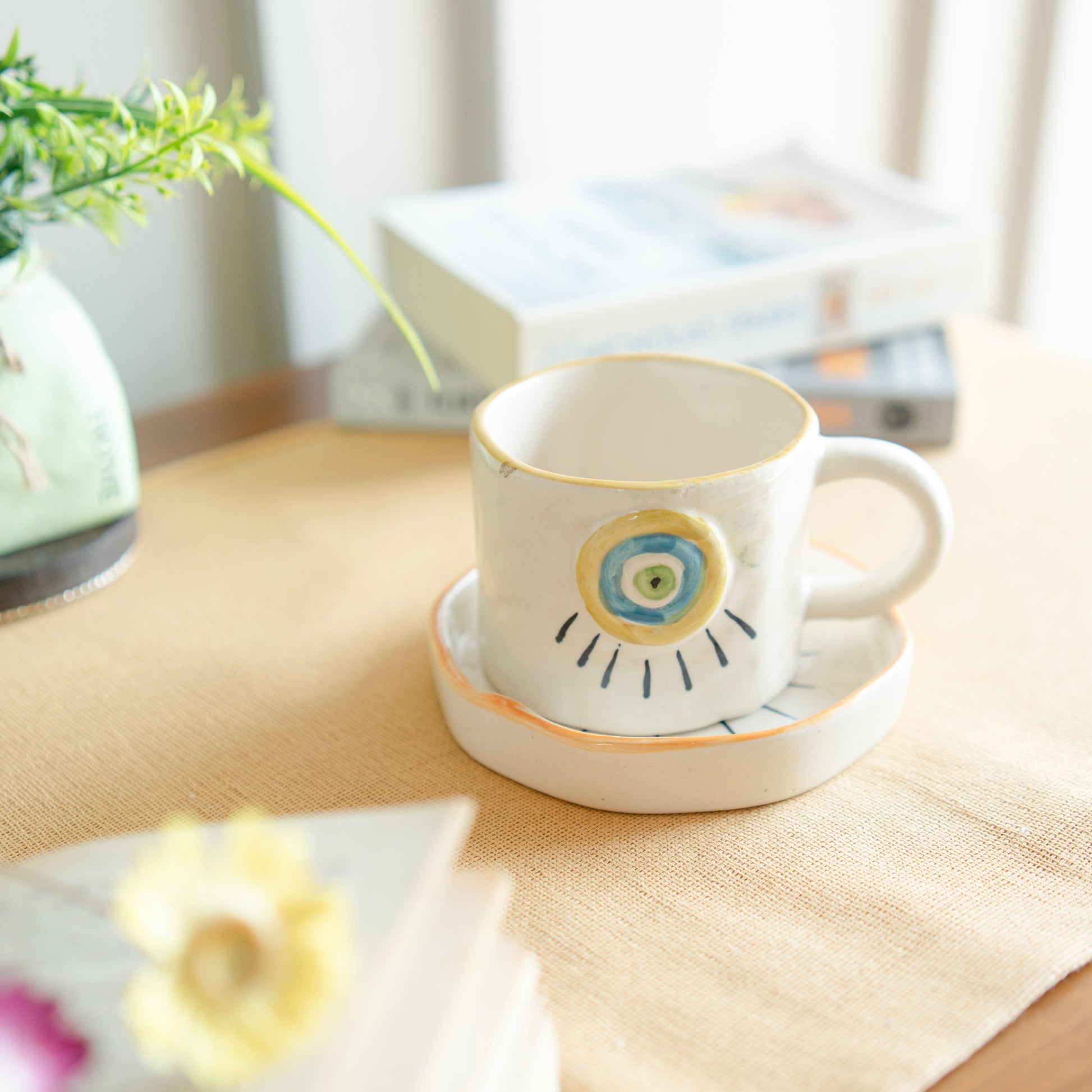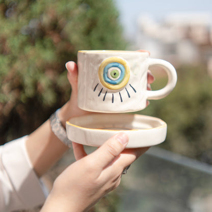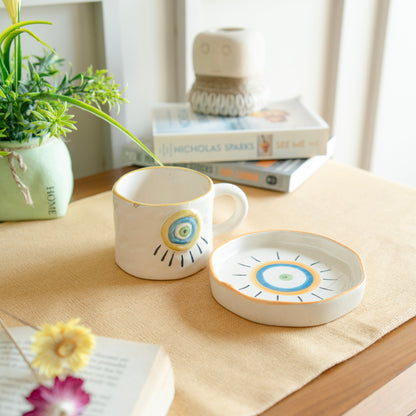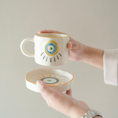 The "Eye of Protection" cup and saucer set often refers to a design that incorporates symbols associated with protection, typically featuring an "evil eye" motif.he central design usually displays a stylized eye, often in blue and white, which is thought to offer protection from envy or bad luck.