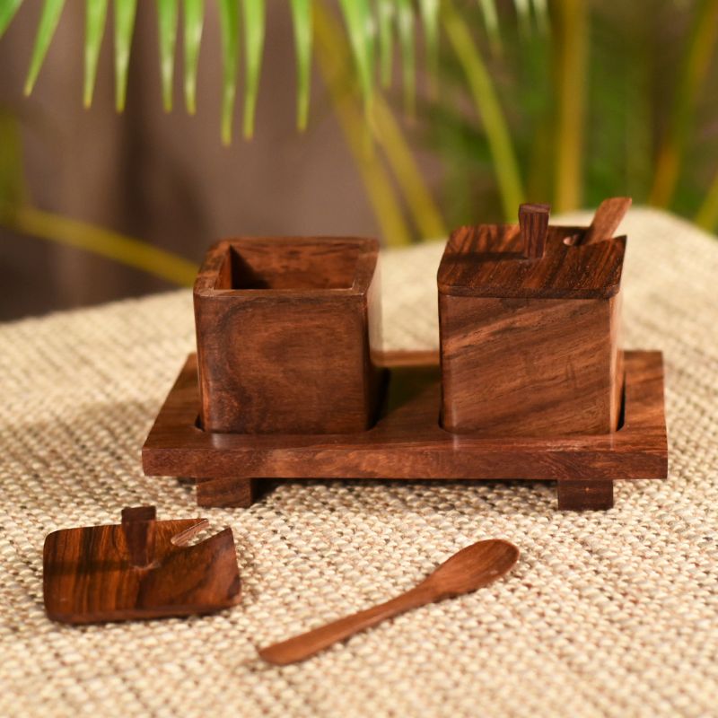 Serve your guests in style in these classy handcarved brown wooden Handi tray set. The spoons are wooden and handcarved by the master craftsmen from UP. The complete set gives an exclusive look and is adored by everyone being served. It is an ideal gifting option for housewarming or Diwali parties_x000D_