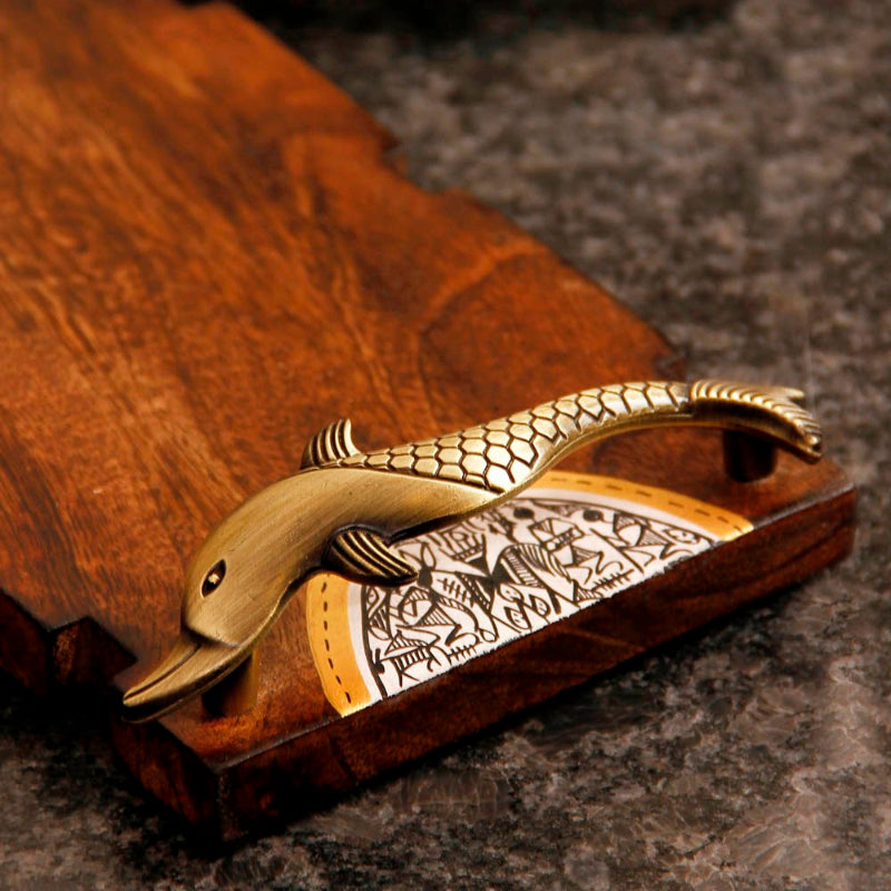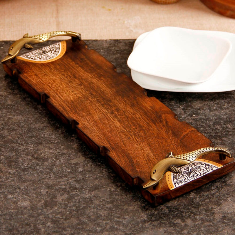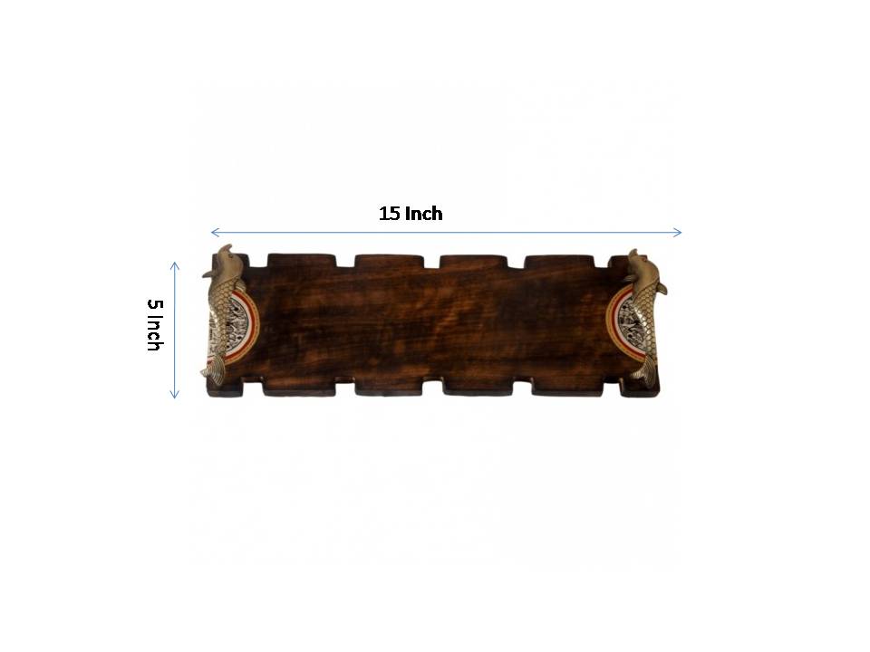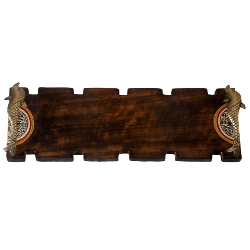 This exquite tray is made of unpolished Sheesham that gives it a rustic edge. The charm of the product lies in the creative combination of the Madhubani art of Bihar and the brass work done in Aligarh. The tray is adorned with fish motif in brass and a monochrome form of Madhubani art. Not only is this tray perfect for your household needs but will be a wonderful present for a loved one.