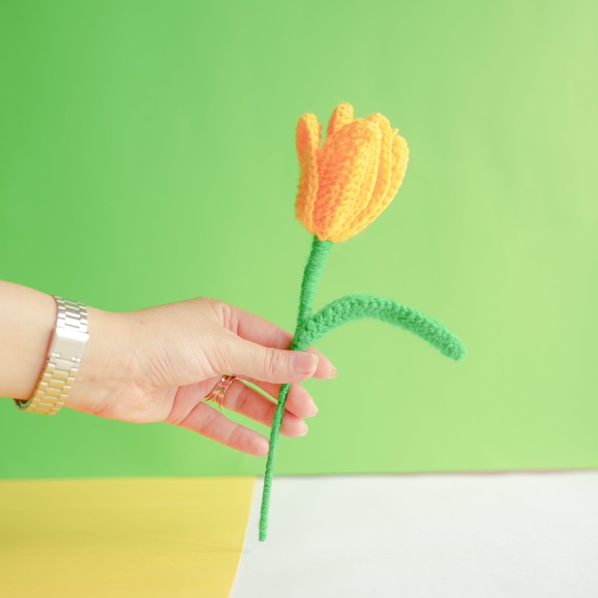 onion vase with yellow crochet tulip