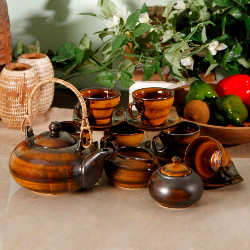 Those who believe simplicity is the ultimate sophistication will undoubtedly be enamoured by this product. Glazed in brown, this set of six cups and saucers, one kettle, one milk pot and one sugar bowl represents the Studio glazed pottery work from Khurja. Tea never felt so good before!